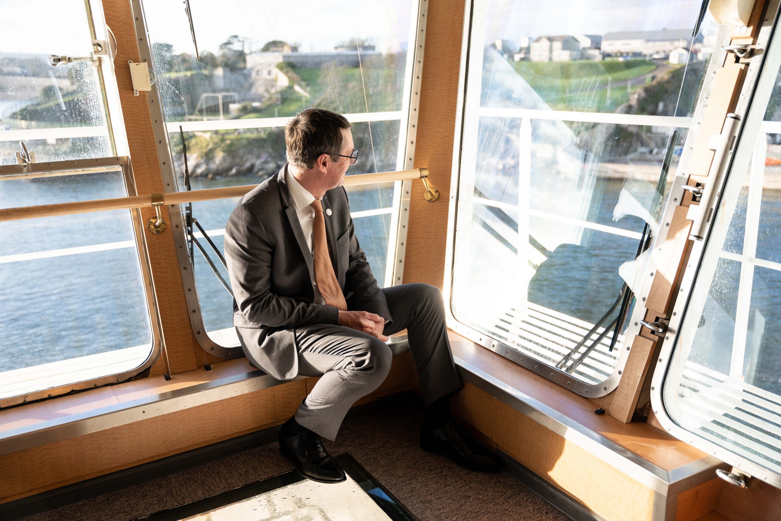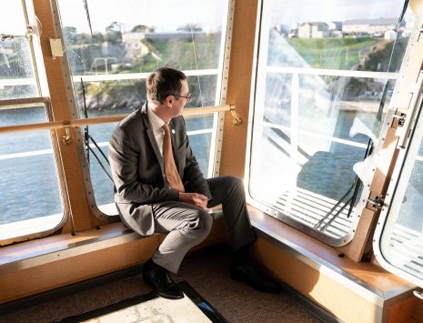 President Jean-Marc Roué on bridge for arrival into Plymouth – photo Jess Breheret