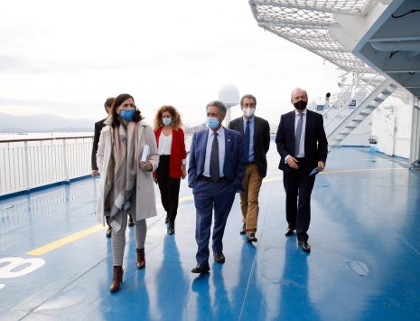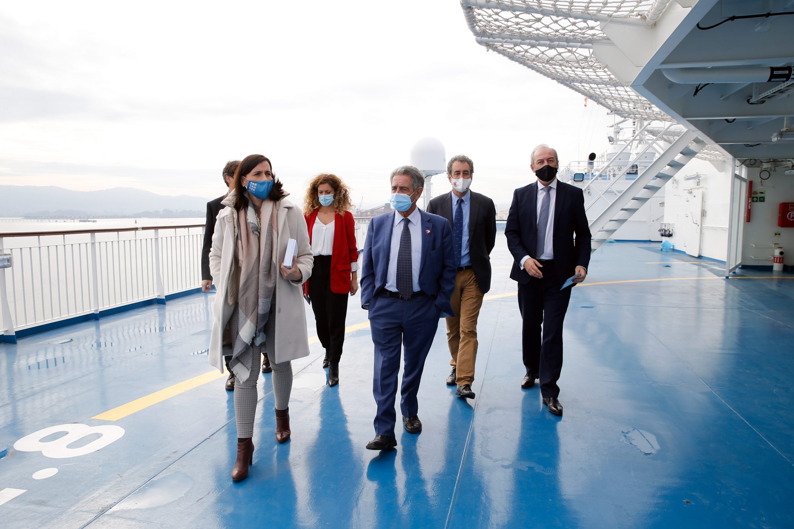 Christophe Mathieu presents deck 10 to Jaime González, port president; Mayor Gema Igual; Government Delegate, Ainoa Quiñones; Cantabria president, Miguel Ángel Revilla & Regional Minister, Francisco Martín